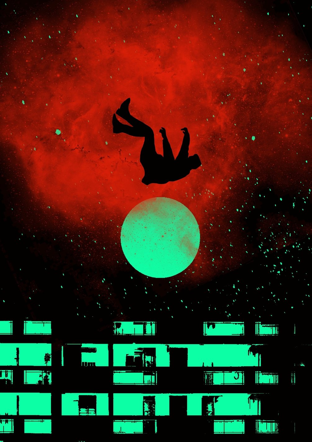 A silhouetted figure falls through a fragmented, artificial reality — surrounded by intense red space and glowing green structures that evoke digital systems, surveillance, and false stability.