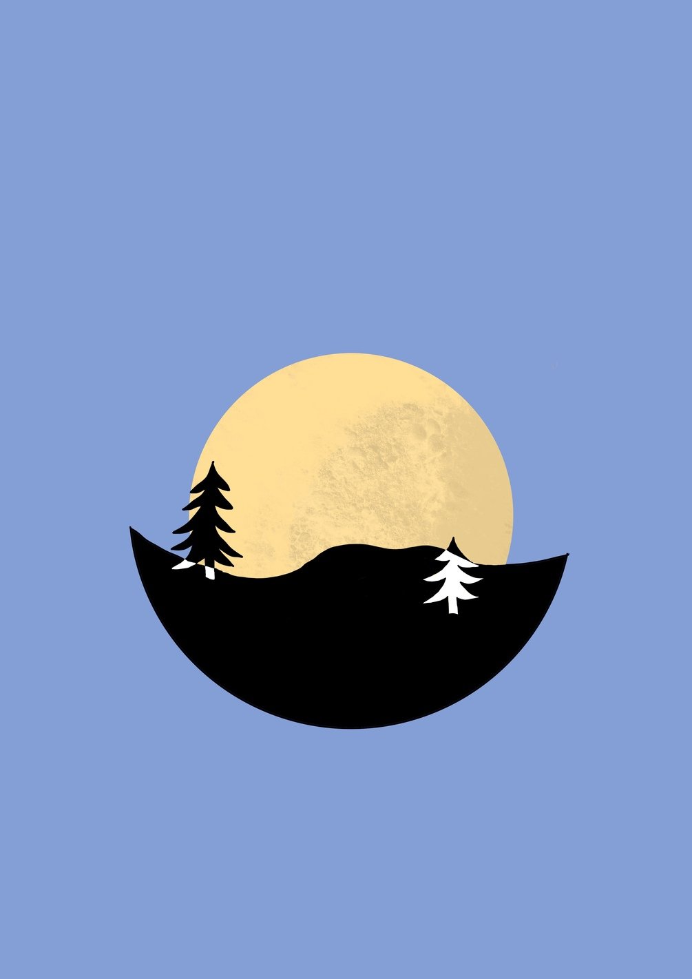 A calm, minimalist moon landscape featuring a soft yellow moon, abstract hills, and stylized pine trees.